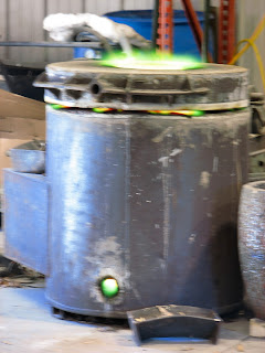 In Atlanta we approved the wax version of the final piece. The wax is then cover in a ceramic shell. The shell has vent holes at the top and bottom. The entire piece is heated and the wax melts and flows out of these holes, leaving the empty ceramic shell. The craftsmen at the Inferno heat bronze in a crucible to over 2000 degrees. The bronze is then poured back into the holes in the plaster shell.