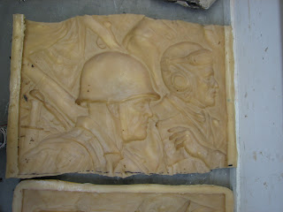Each panel, consisting of wood, clay and paper, weighed about 500 lbs. Fortunately, the foundry had a forklift. No more lifting for me!!